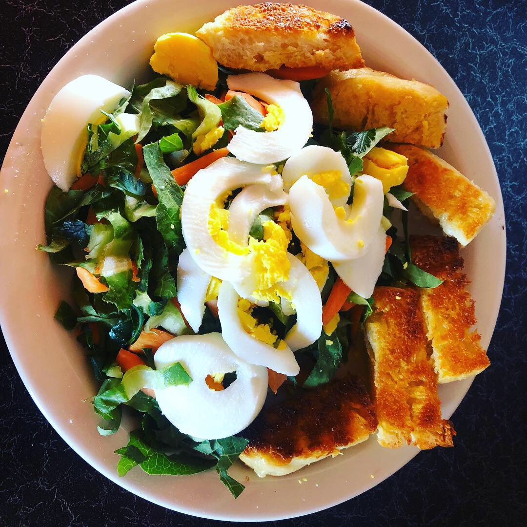 In short, this is leftover salad made from ingredients I grew, boiled egg, toasted homemade steamed bread.