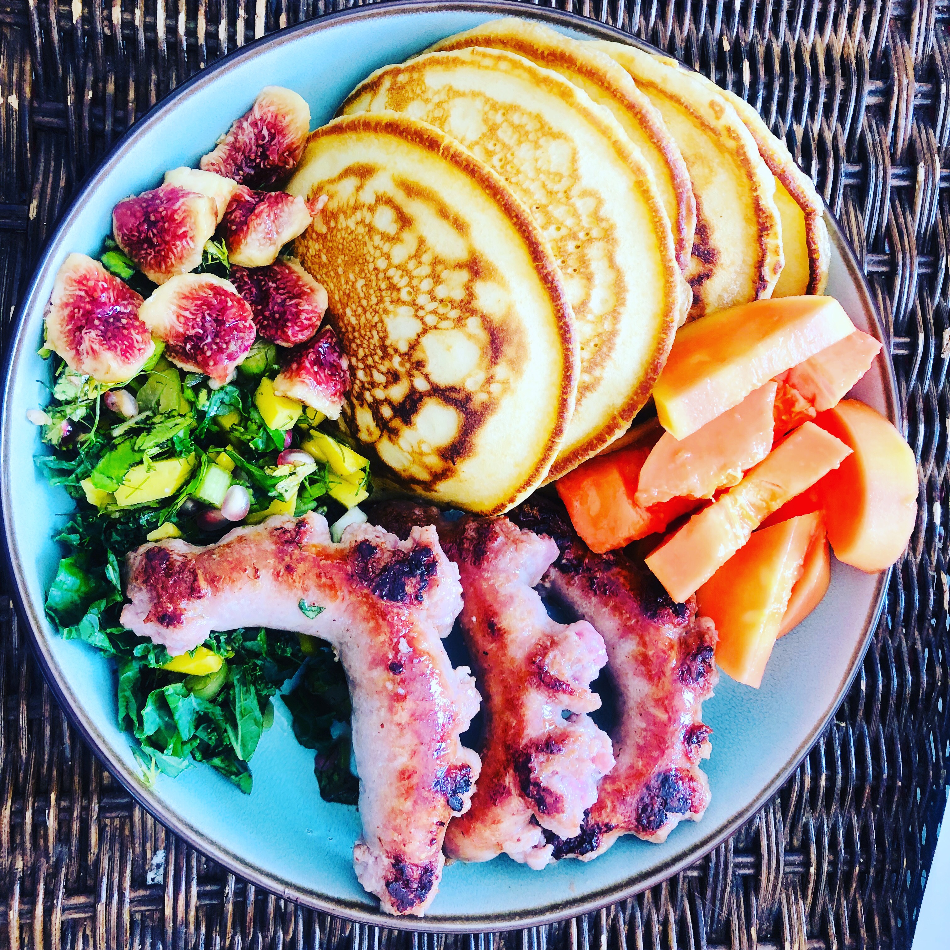 Then I have some fig and pawpaw, pork sausages and the fluffy pancakes.