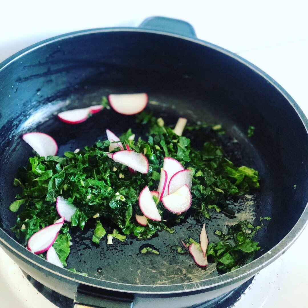 In a medium hot pan, sauté the garlic and celery for about a minute and then add the spinach, parsley and radish. Sauté this for 2 minutes, add a dash of soy sauce, and remove from the pan after 3 minutes.