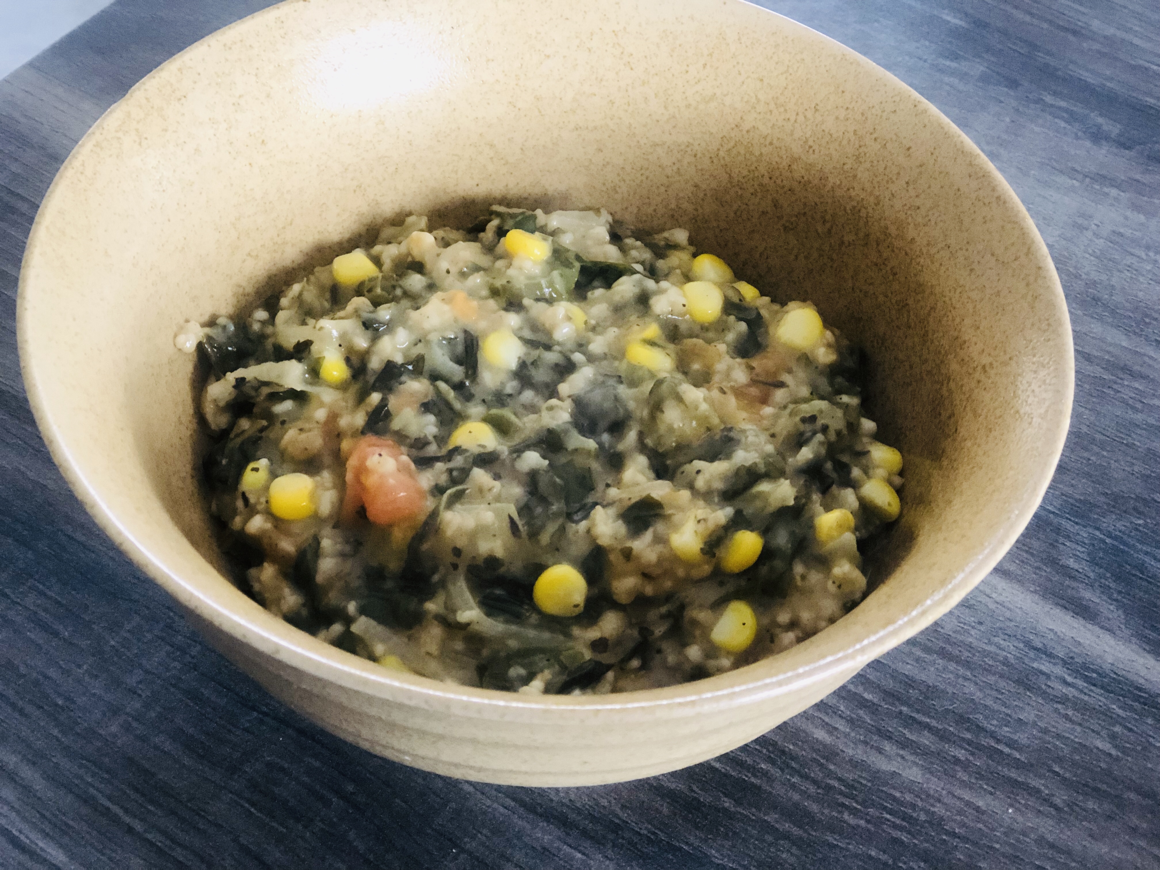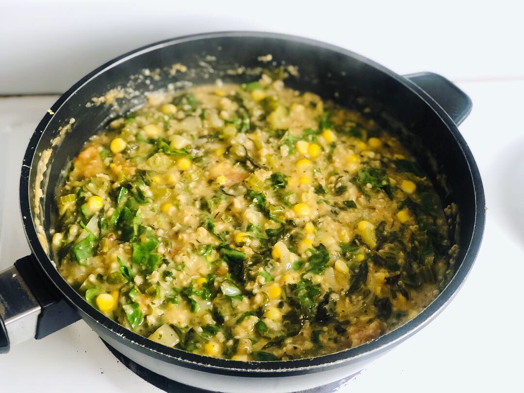 Saute onion and celery in the olive oil on medium heat. Add the mixed herb, keep sautéing. Add the oatmeal and half the spinach and keep sautéing. Keep adding two table spoons of the vegetable stock as the oatmeal keeps sticking to the bottom of the pan. Don’t be tempted to add all the liquid all at once!
