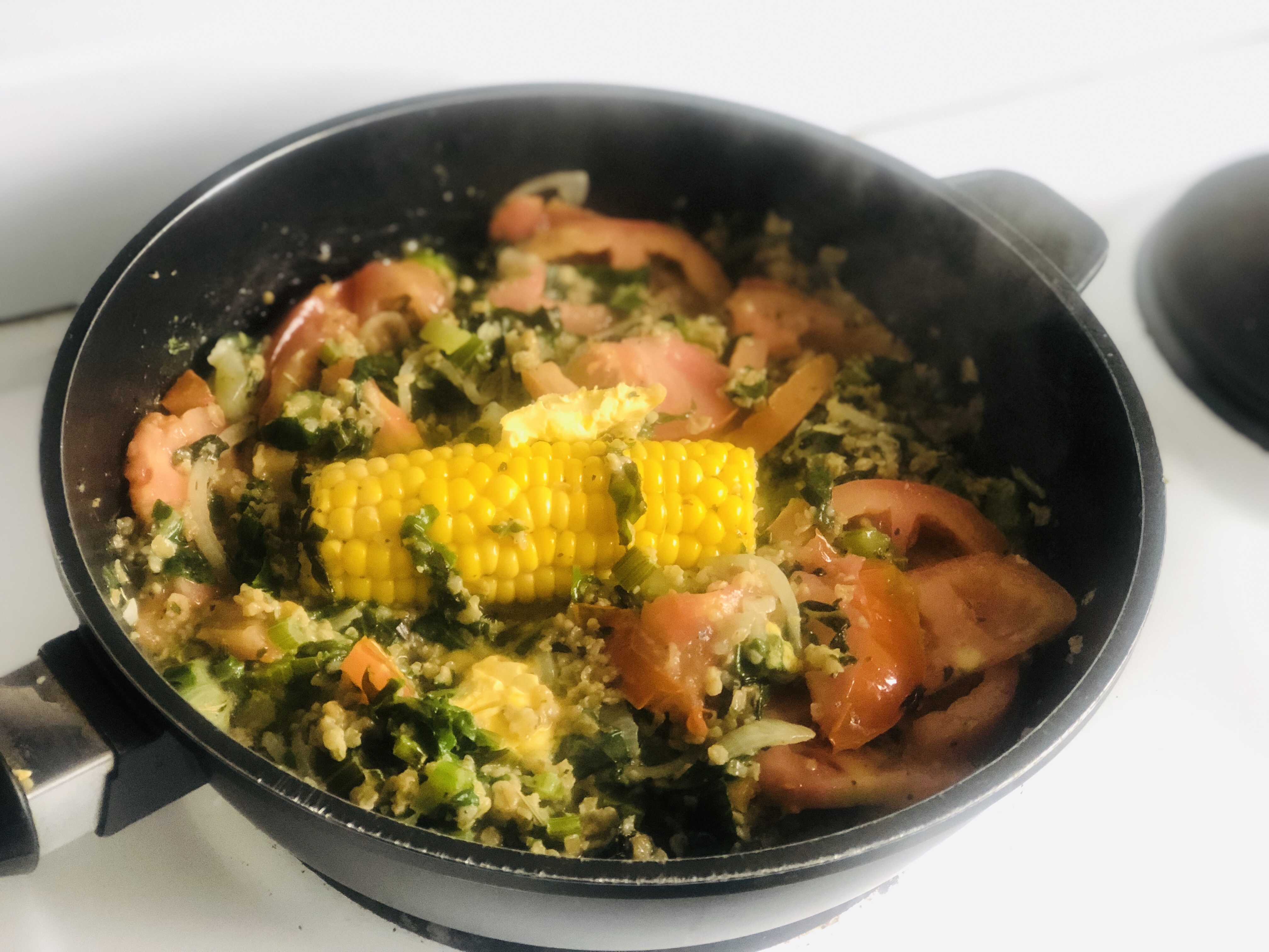 Add the tomato slices and put the sweet corn with cob on, in the pan and close the pan. Open now and then to keep adding tablespoons of the vegetable stock.