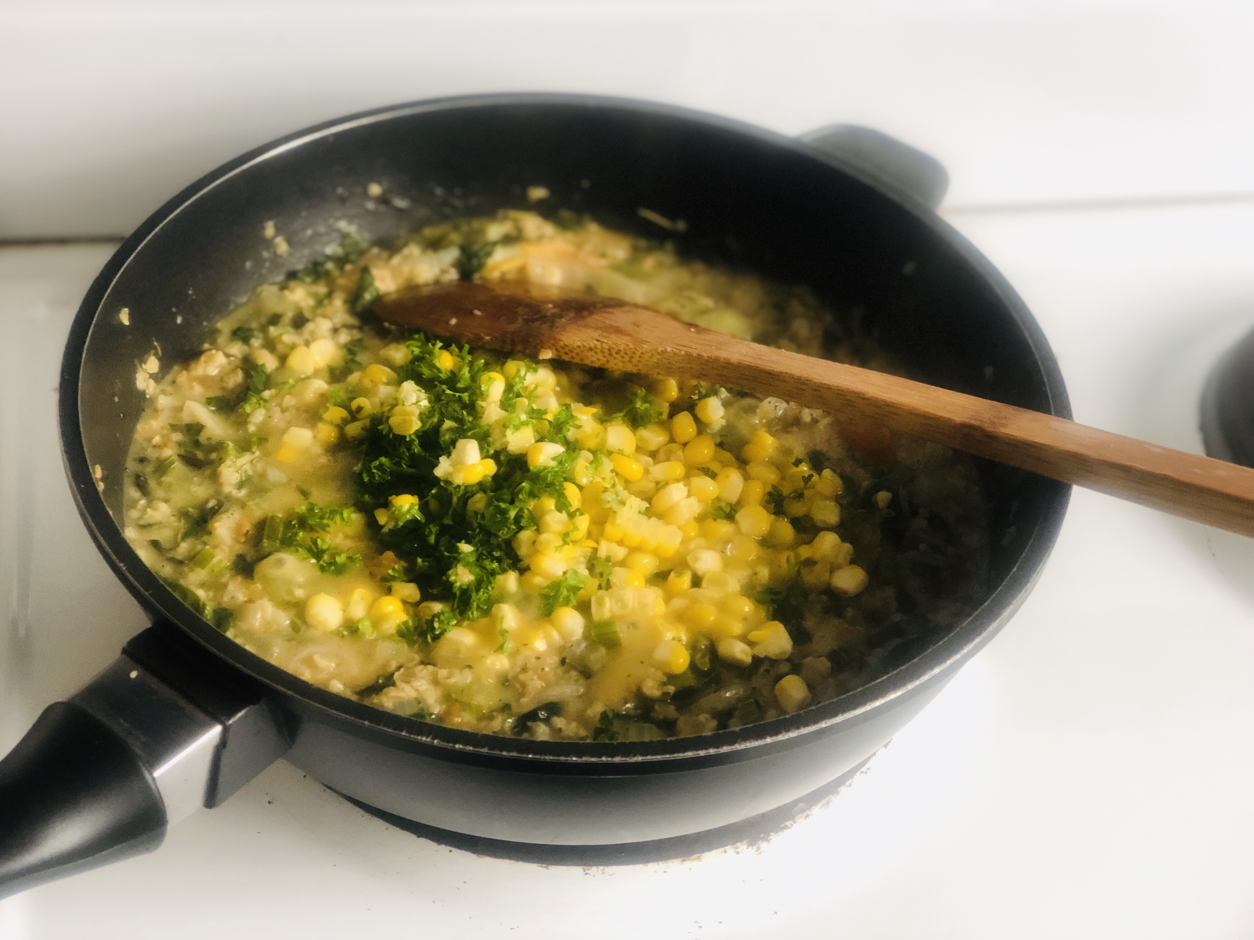 After about 5 minutes, remove the sweet corn and use a knife to get the corn off the cob, add the sweet corn and parsley to the pan, add more tablespoons of vegetable stock and close the lid and reduce the heat to simmer.