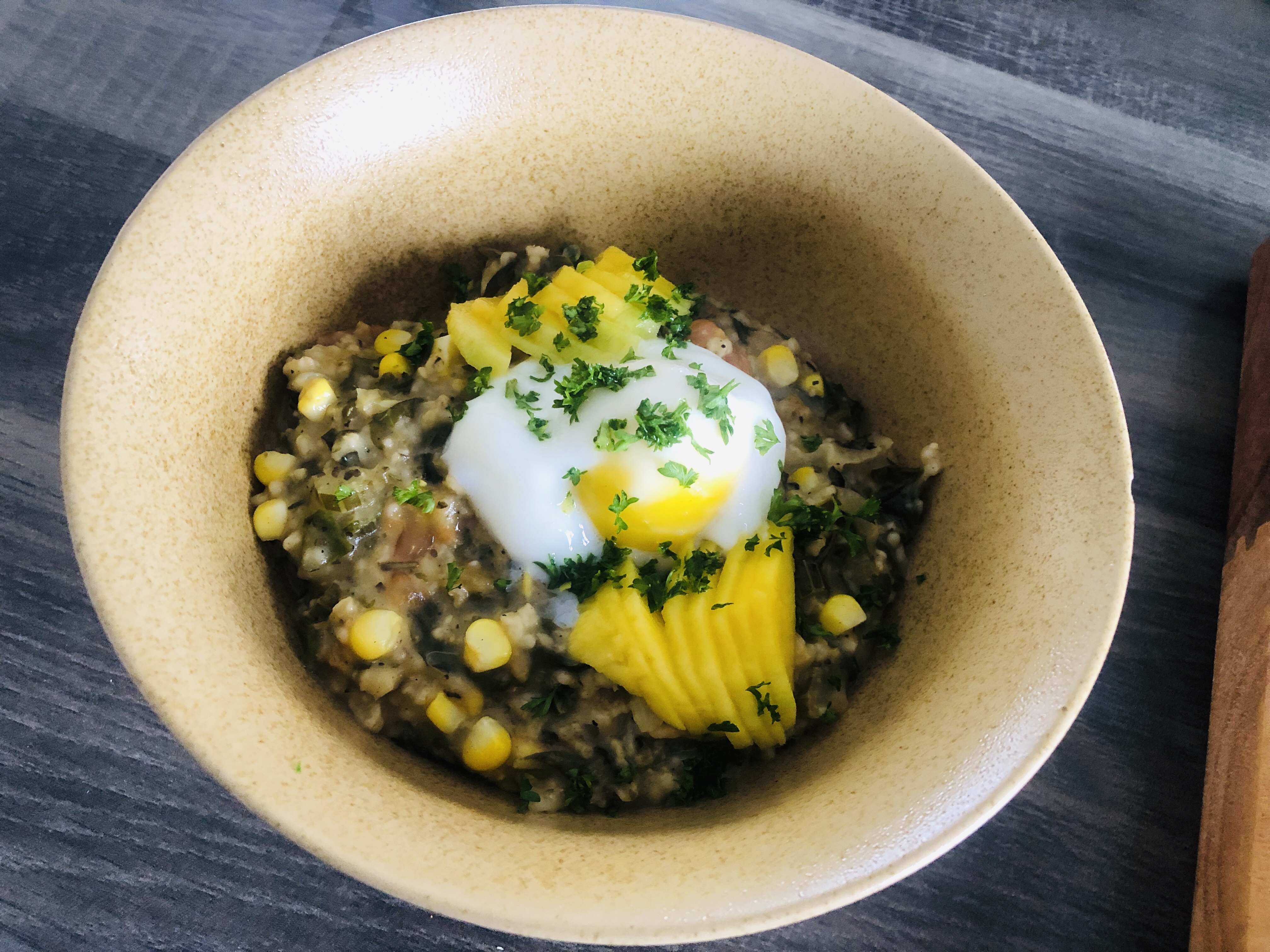I served this with a poached egg, fresh parsley and mango slices.