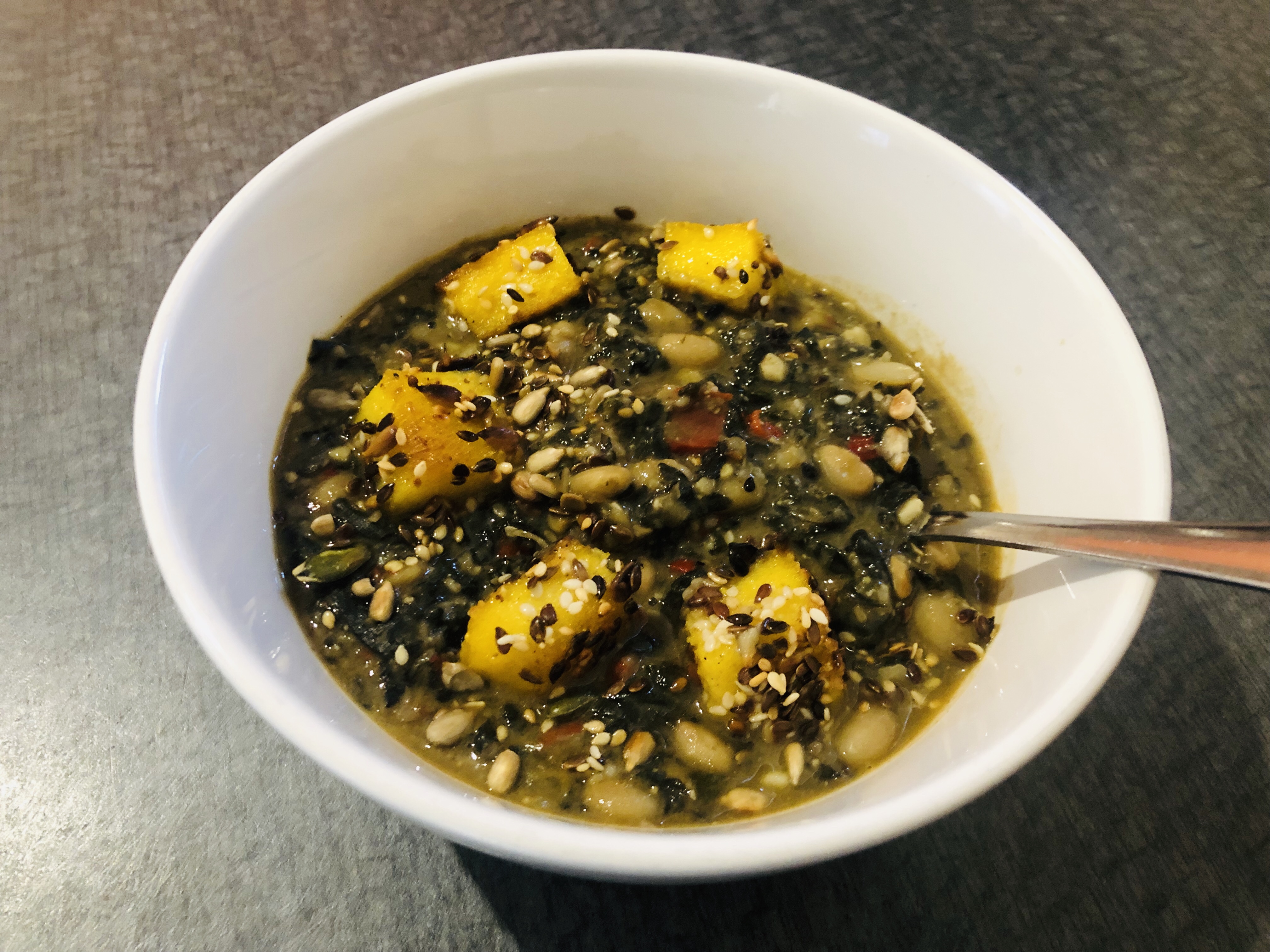 Serve the soup with your polenta and some pan toasted seeds from your pan and enjoy.
