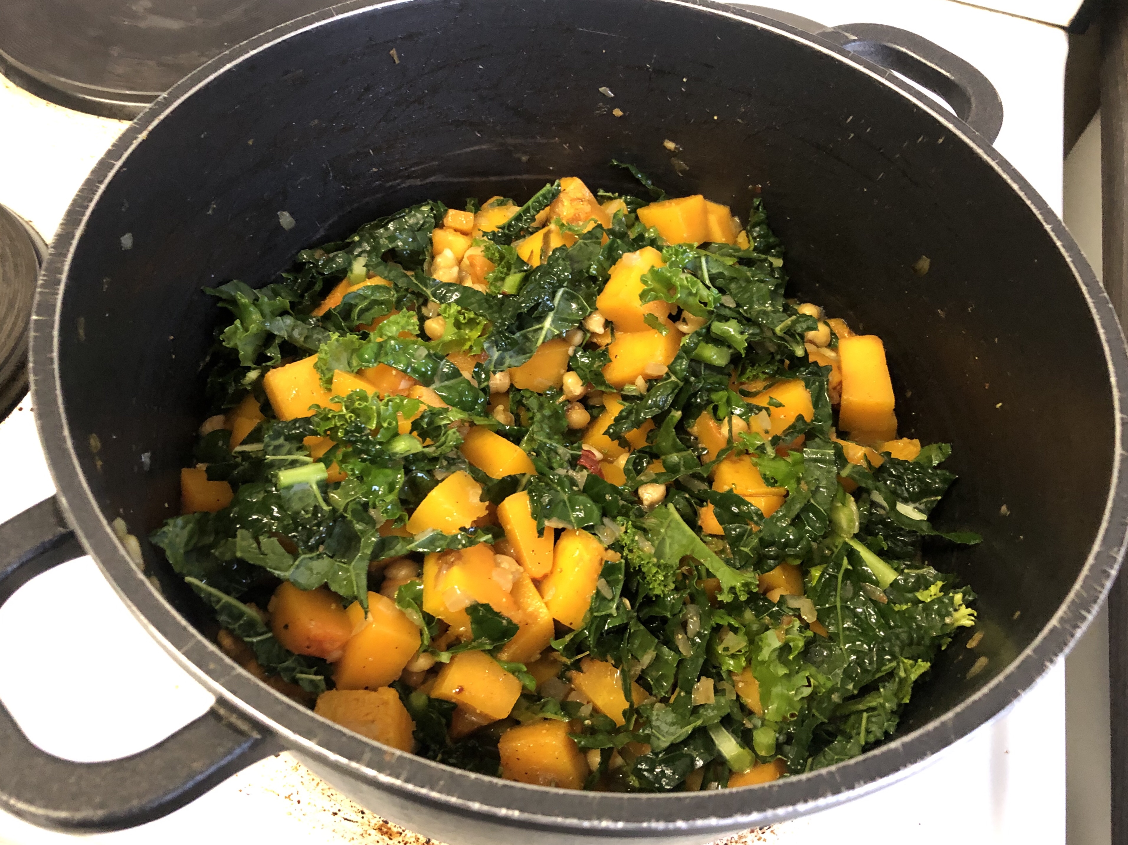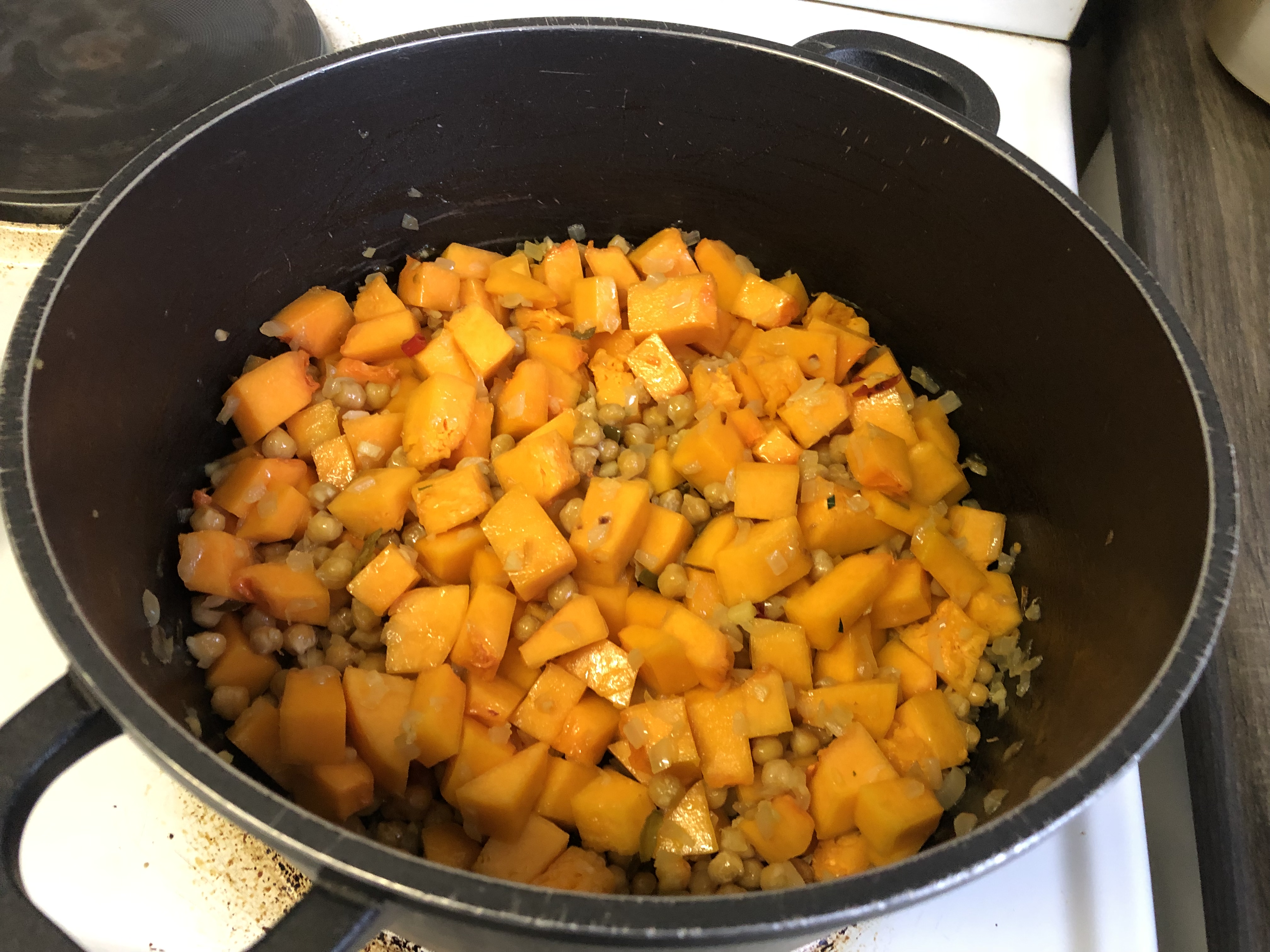 1. Soak chickpeas for an hour, covered. Drain chickpeas. Heat olive oil on low and sauté onion, chickpeas and butternut together in a pot. Put the lid on after 20 minutes. Stir after 15 minutes.