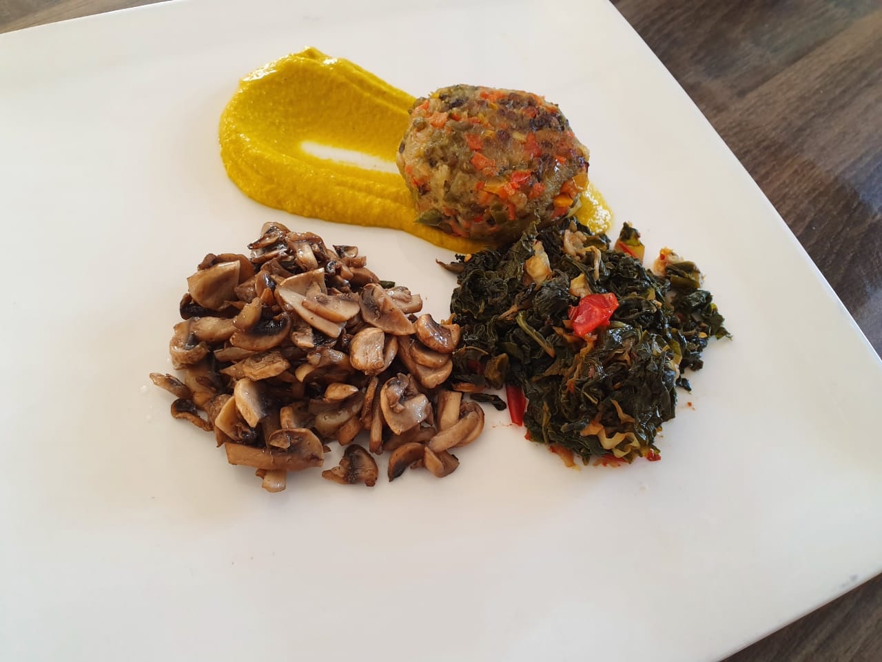 Serve with vegetables or a stew. Here I served with a poached on wilted spinach, sautéed mushrooms and an avocado and carrot purée (1 avocado and 1 cup carrot placed in a blender with 1 tablespoon extra virgin olive oil).
