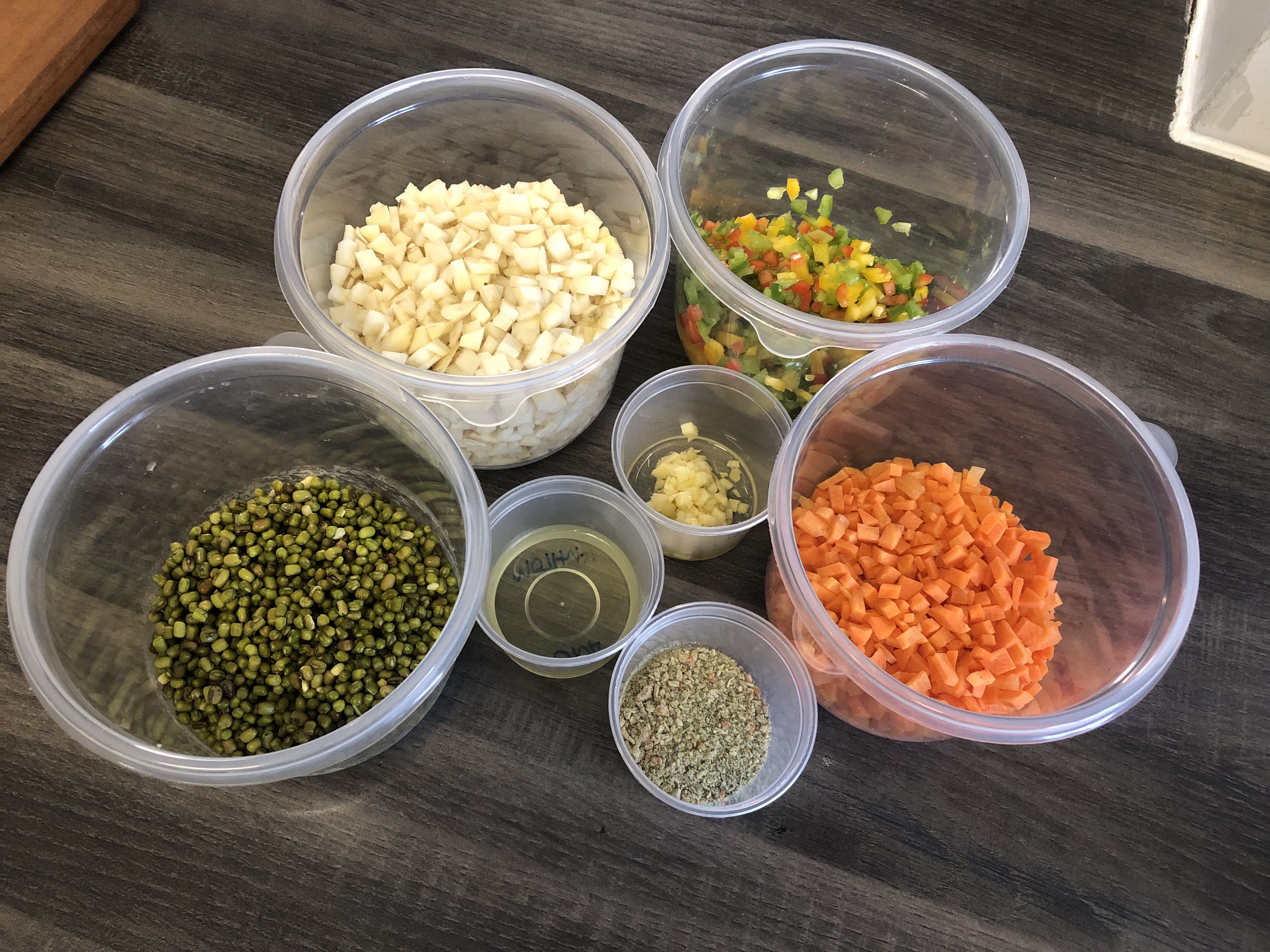 Sauté Sweet Potato, mung beans and carrots in olive oil on low heat until the vegetables are just about soft. Put the lid on after 10 minutes. Stir occasionally.