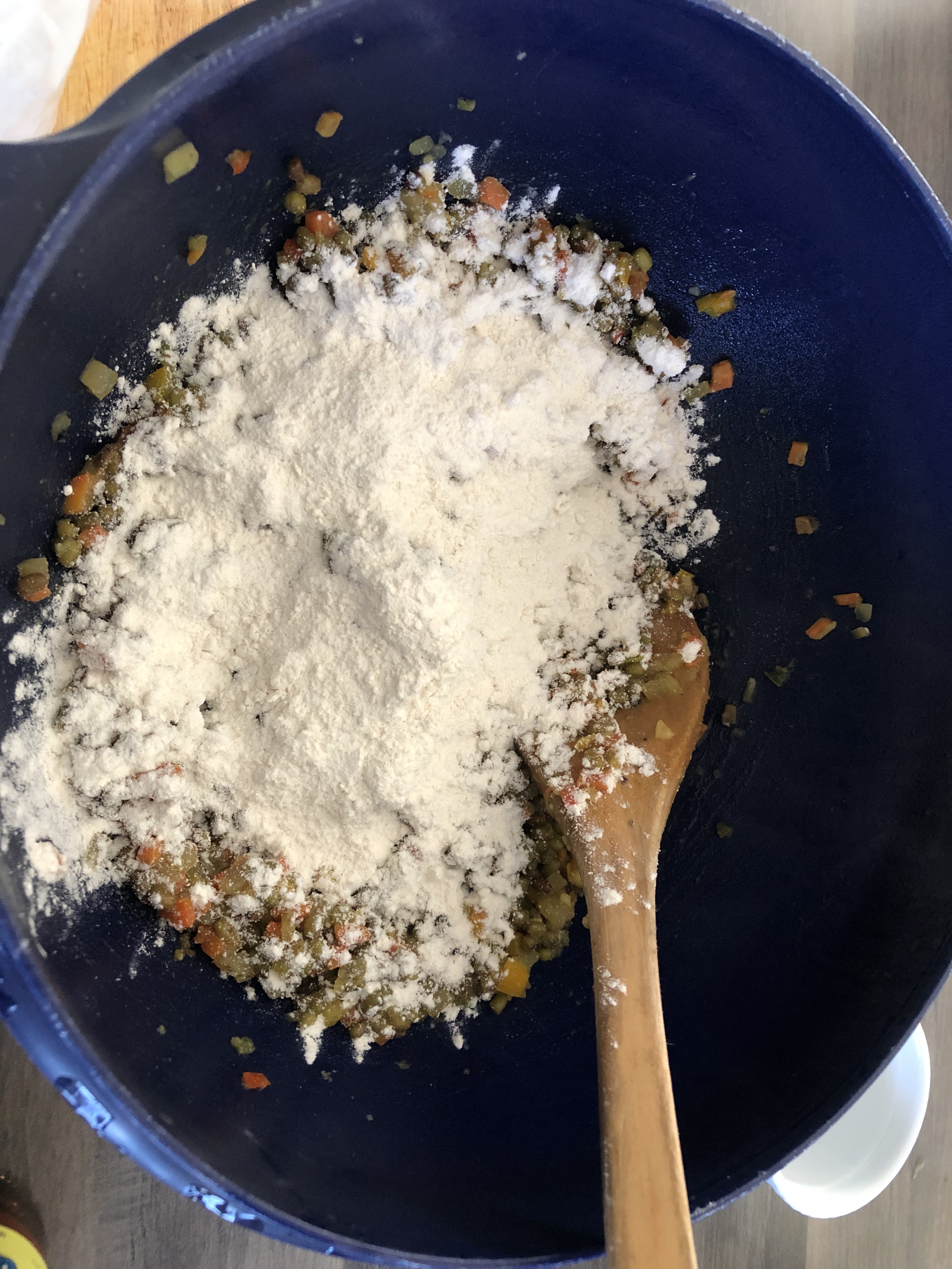 After 30 minutes, add the vegetable stock granules, robot peppers and ginger. Stir and put the lid back on for 15 minutes.