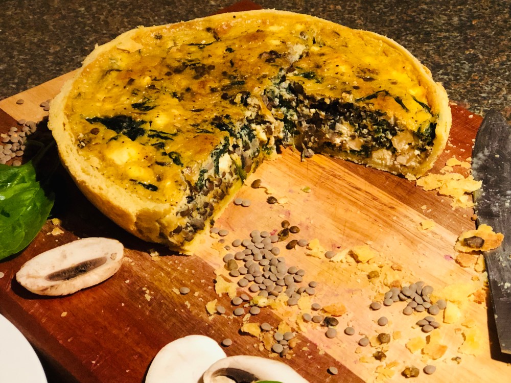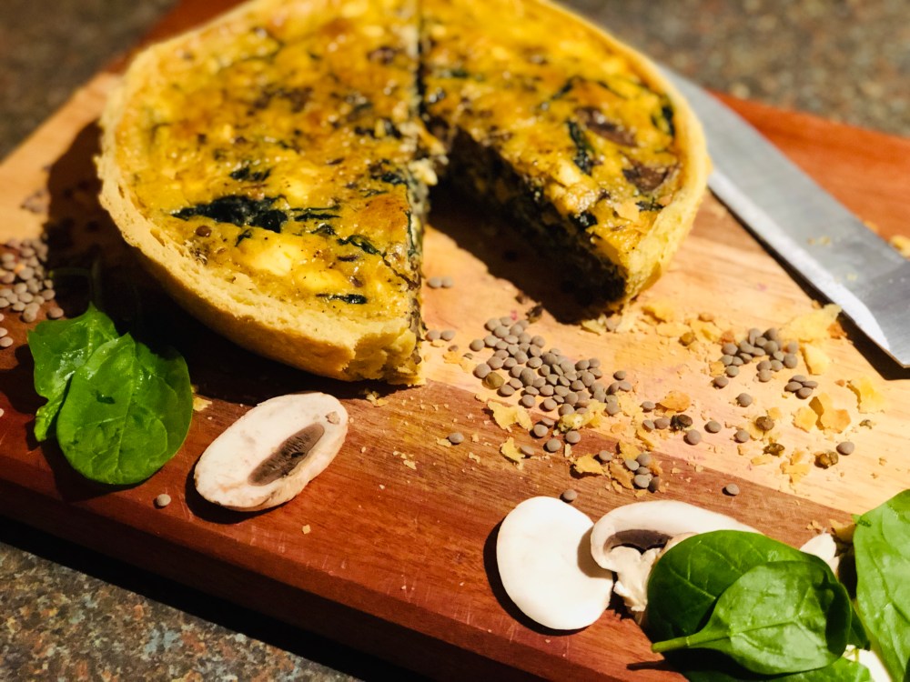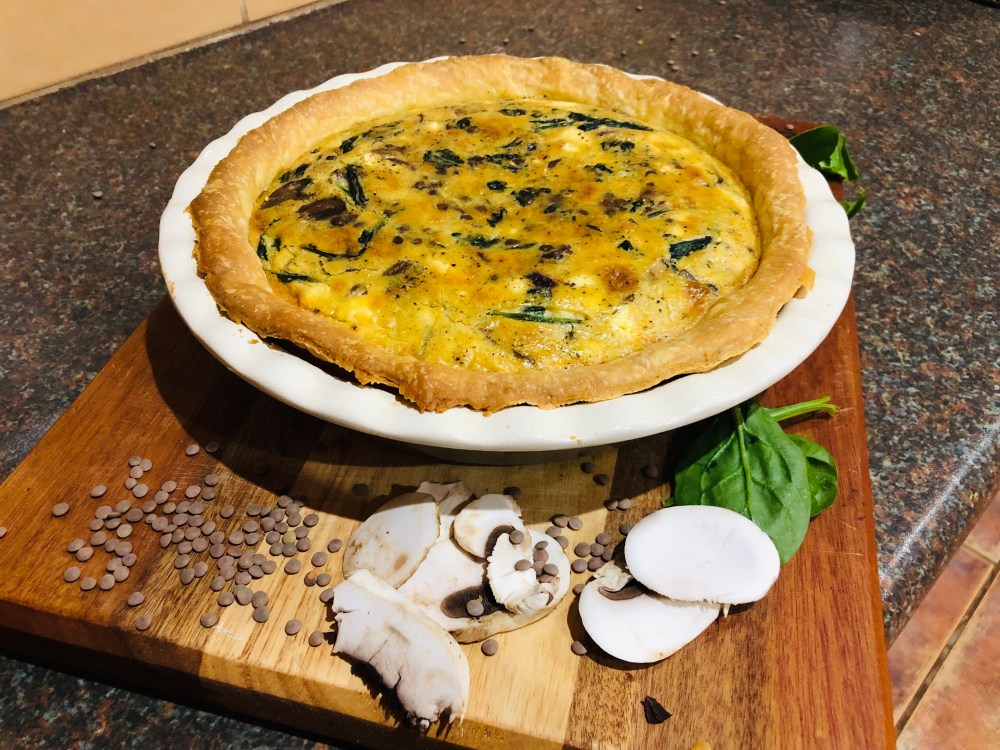Brown Lentil, Spinach, Mushroom and Feta Quiche in a beautiful butter flaky crust.
