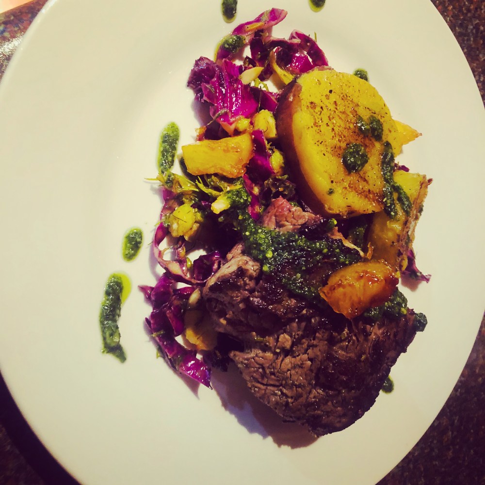 Sweet Potato | Red Cabbage and Fennel Slaw in a Red Pepper & Sun Dried Tomato Pesto and a drizzle of Lemon Honey Vinaigrette | Beef Fillet | Basil Pesto | Drunken Pineapple