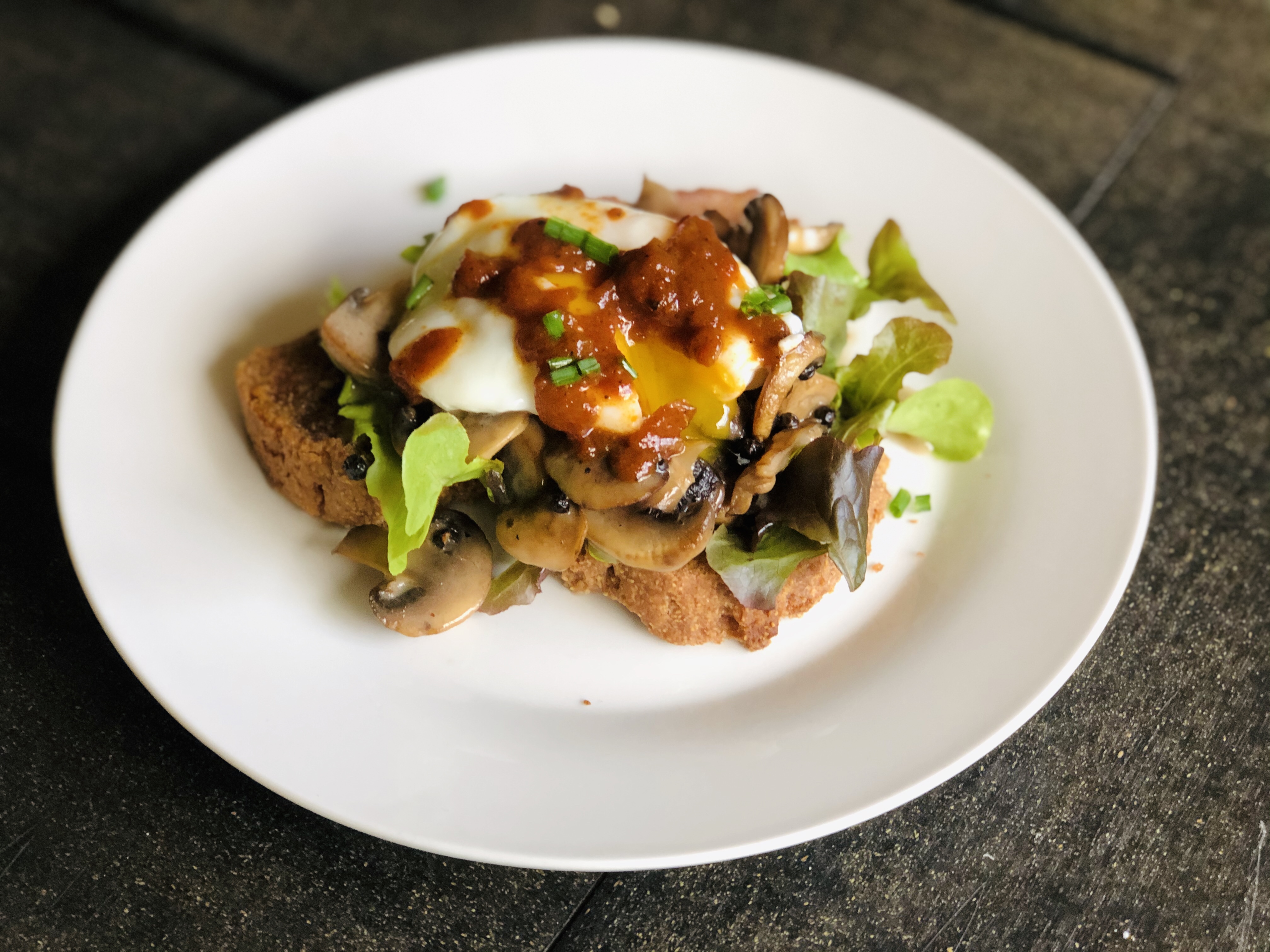 Vegan Bread | Lettuce | Sautéed mushrooms in coconut milk | Poached Egg | Tomato Gravy