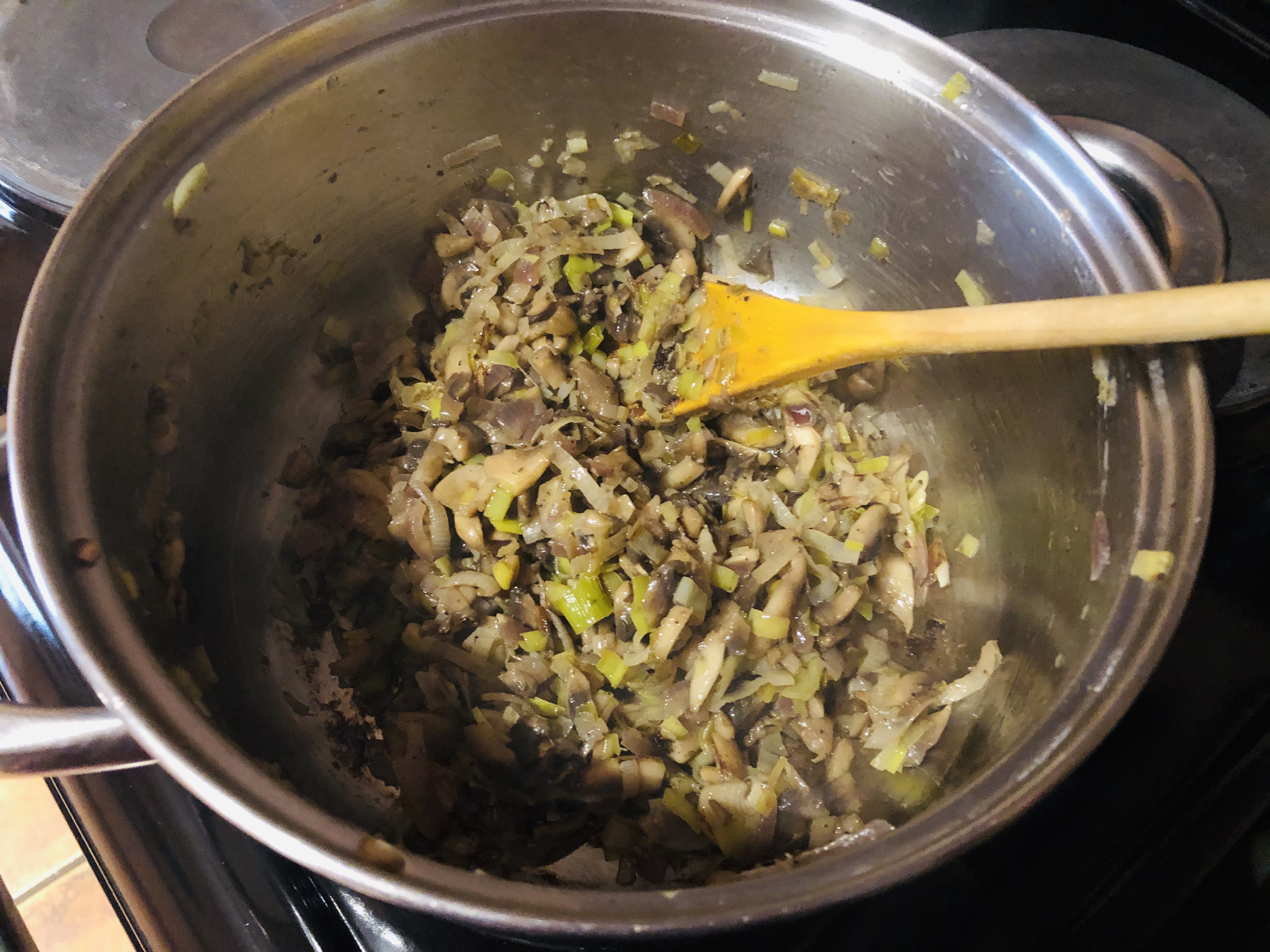 1. Sautรฉ leeks and red onion for 5 minutes.