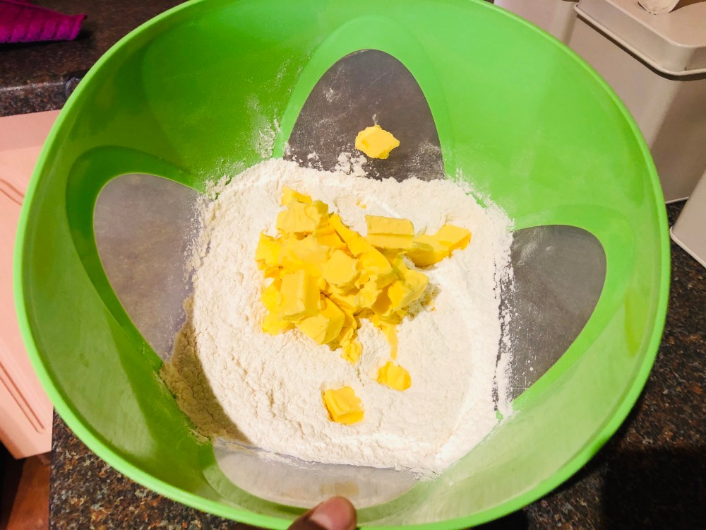 2. Add the butter and rub it in to form coarse bred crumbs.