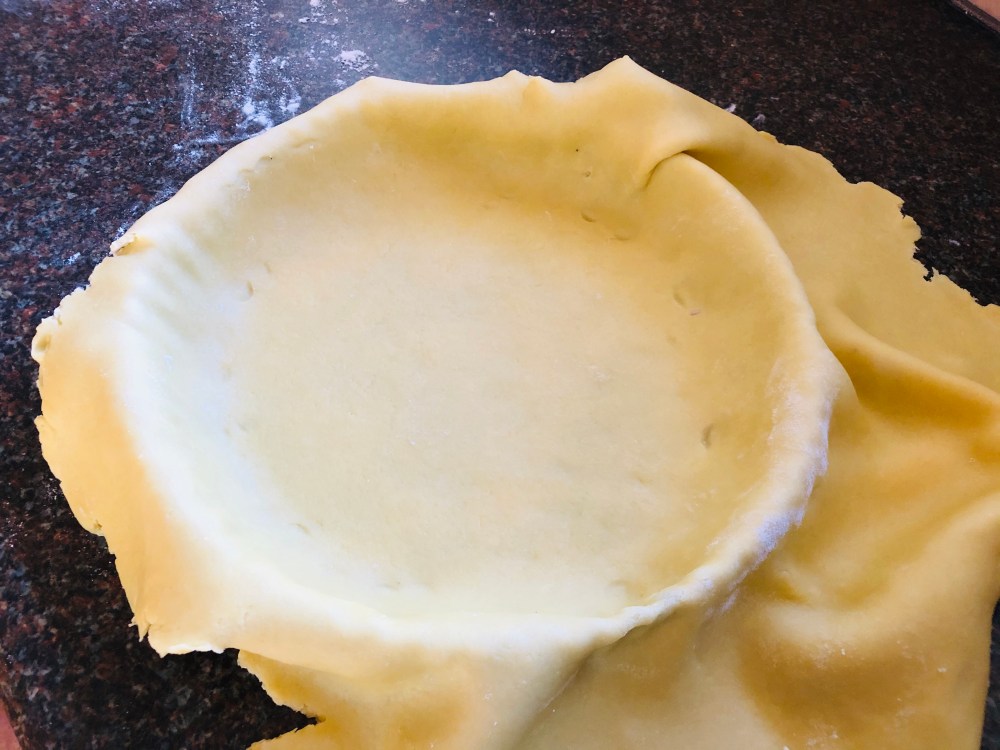 9. Roll the dough onto the rolling pin and then unroll this dough onto your quiche pan. The dough should overlap the sides of the pan.