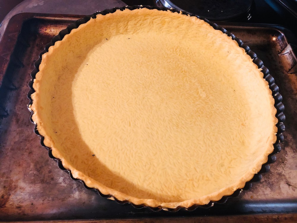 13. Take the crust out of the oven and let it cool for a few minutes. Remove the rice/beans.