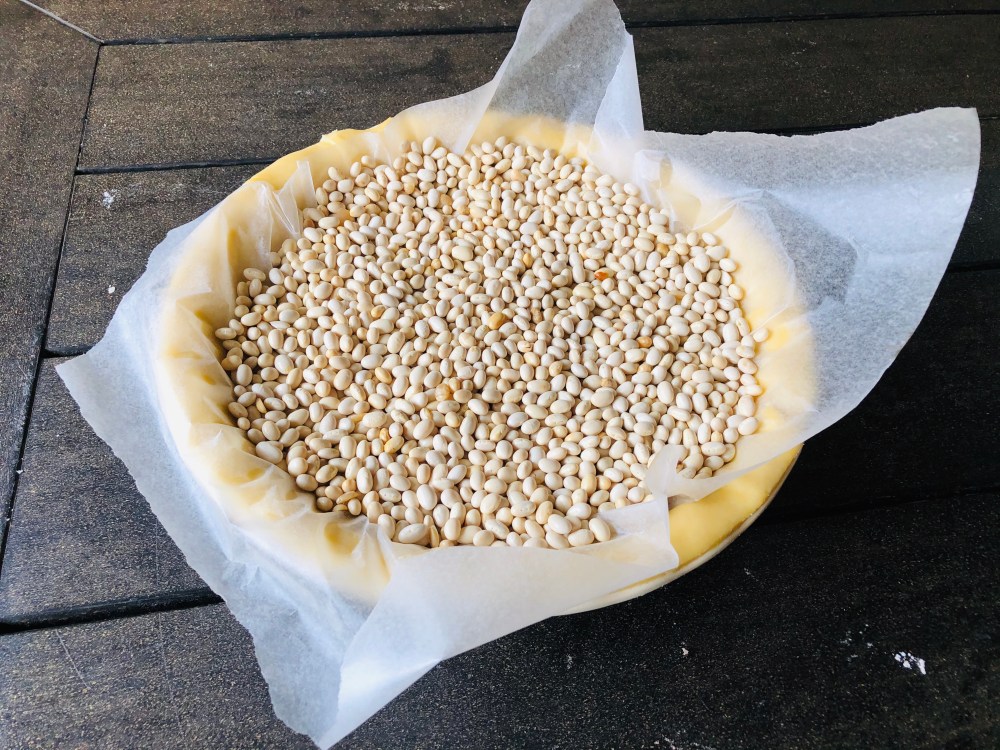 11. Pour beans/rice into the dough all the way up to the brim. You can use wax paper or foil in the pan before adding the beans/rice for easy lifting when you want to remove the beans/rice.