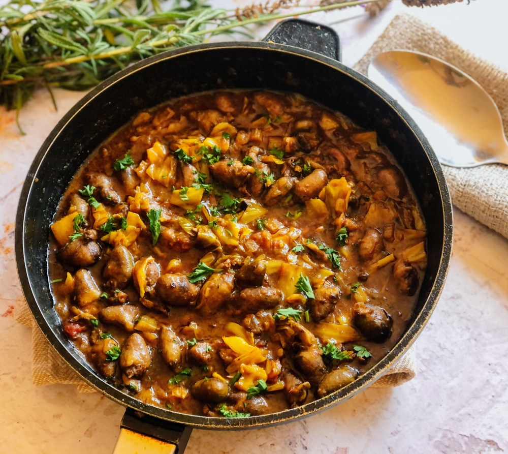 A hearty stew made from 2 key ingredients – chicken hearts and cabbage. Simple and homely.