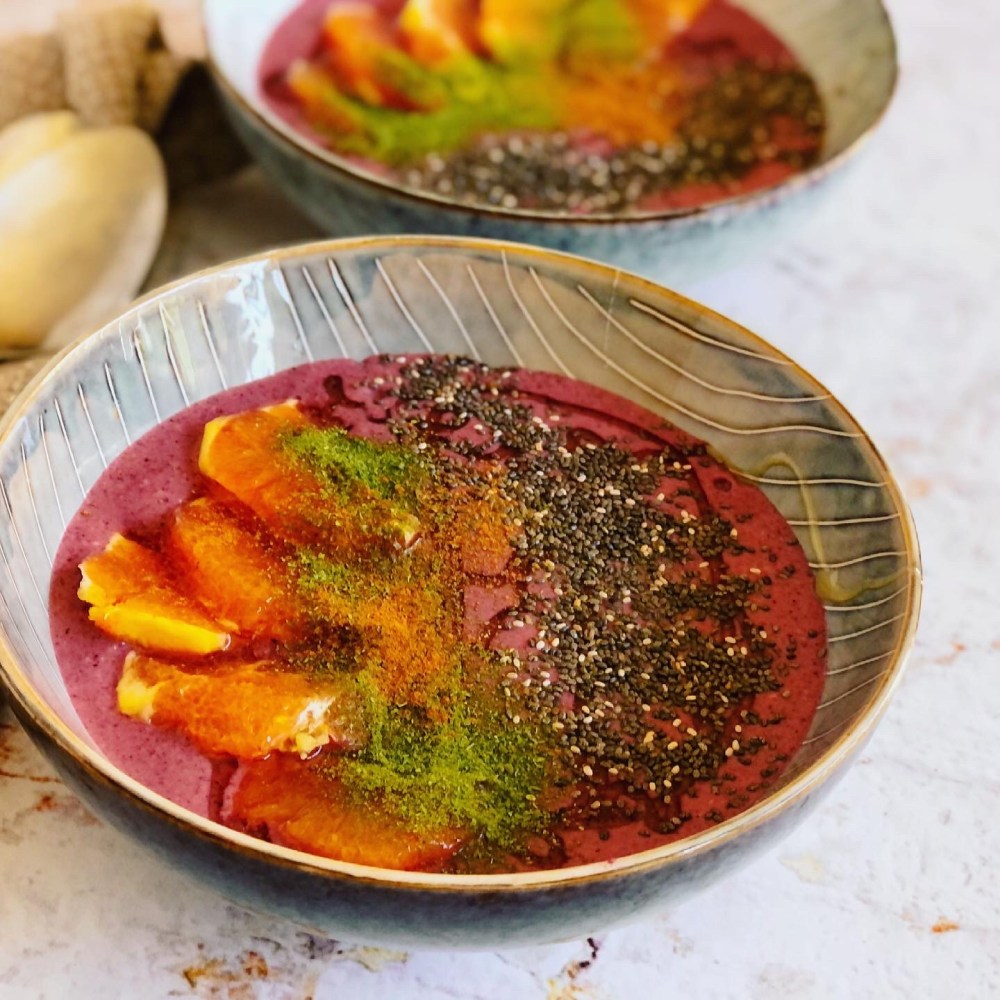 - Serve into your chosen bowls and garnish with the orange, chia, cinnamon and moringa. You can drizzle with a bit more honey if you would like.