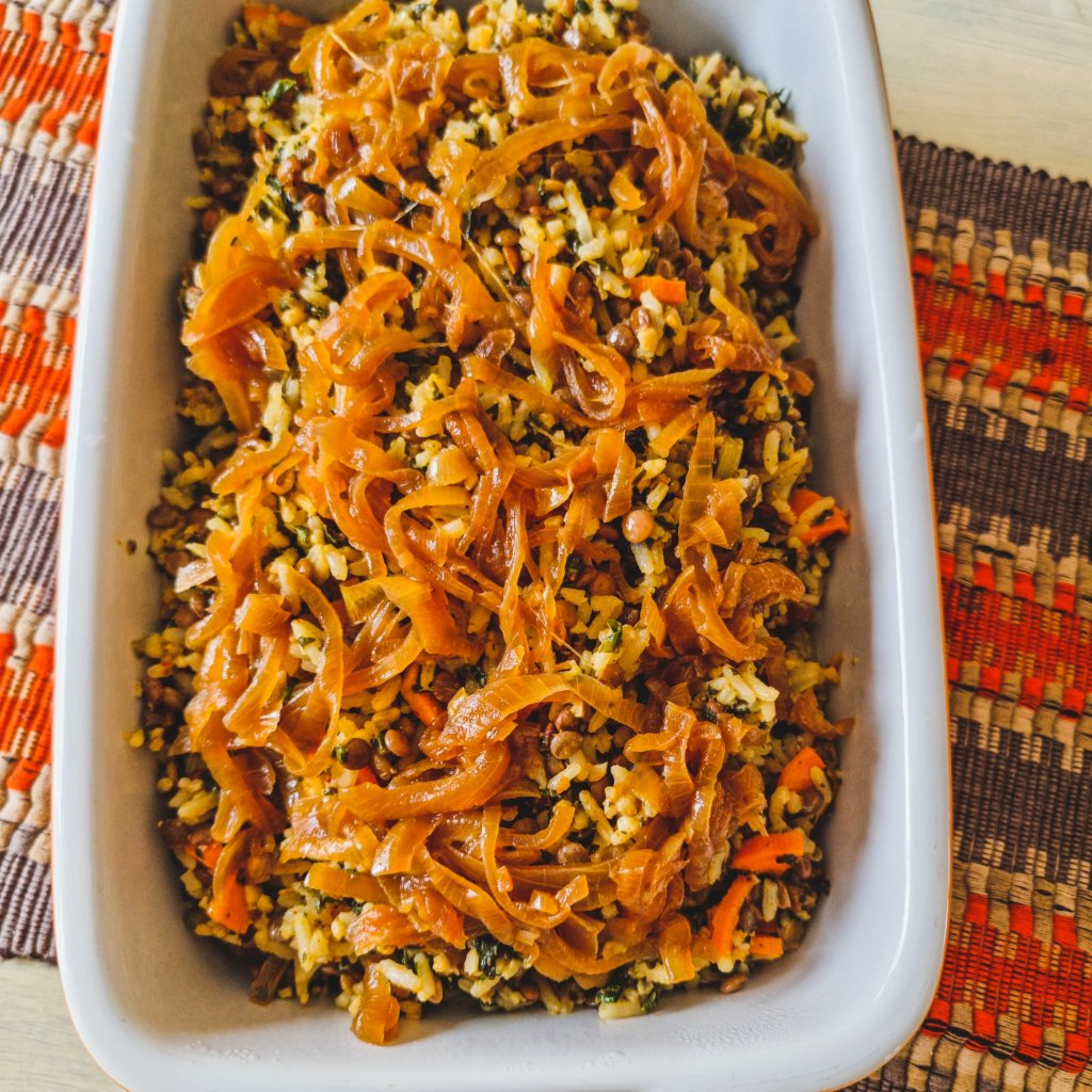 This recipe is quick, given that we are working with cooked rice and lentils. Using left over rice is a great idea if you have some. The lentils are boiled in water for 10 to 13 minutes and after the onions are cooked, it’s a matter of sautรฉing the rice, lentils and vegetables for a few minutes then layering with the onions and serving.