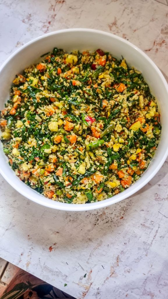- In a salad bowl, add the baby spinach, the red apple, olives, and the cooked cauliflower and mixed vegetables.