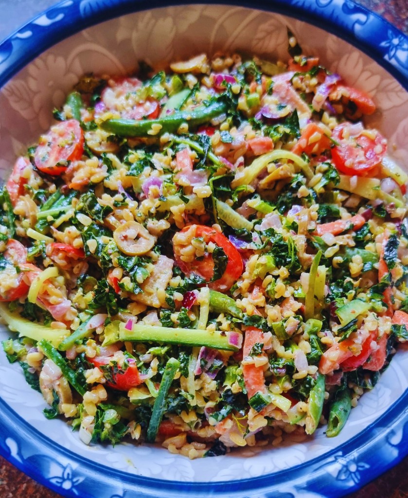 Ingredients include kale, bulgur wheat, cherry tomatoes, cucumber, olives, and olive oil. This salad comes together in just a few simple steps here <a href=”http://<a href=”https://payhip.com/b/AyeY6″ class=”payhip-buy-button” data-theme=”green” data-product=”AyeY6″>Buy NowGrab Your Recipe Now